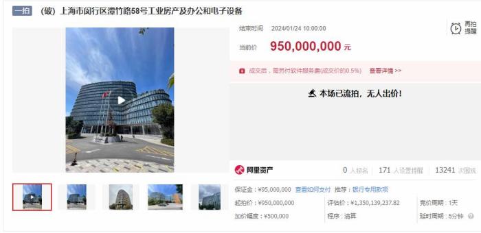 本次拍賣標的評估總價約為13.5億元,以9.5億元的價格起拍,約為評估總價的7折。拍賣于1月23日上午10時至1月24日上午10時止,雖然這場拍賣有超過1.3萬人圍觀,但最終無人出價,以流拍結束。