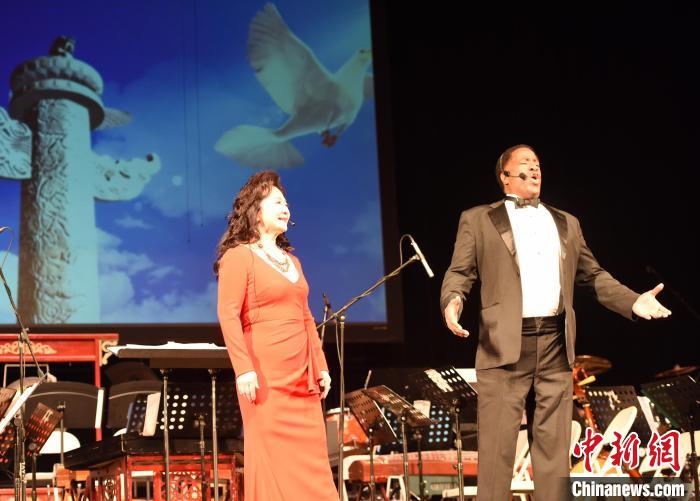 當地時間1月27日晚,以紀念中美建交45周年為主題的鷹飛龍騰新年音樂會在美國洛杉磯唱響。圖為中美兩國歌唱家聯袂演唱《我愛你中國》。 中新社記者 張朔 攝
