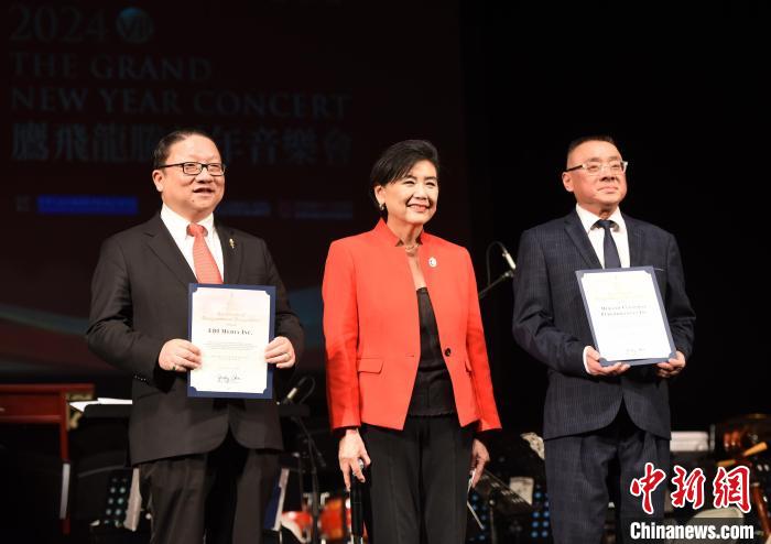 當地時間1月27日晚,以紀念中美建交45周年為主題的鷹飛龍騰新年音樂會在美國洛杉磯唱響。圖為美國聯邦眾議員趙美心(中)向美國鷹龍傳媒董事長蘇彥韜(左)等主辦方代表頒發賀狀。 中新社記者 張朔 攝
