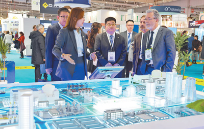 2023年11月在法國巴黎舉辦的第五屆世界核能工業(yè)博覽會上,中國核工業(yè)集團工作人員在向法國原子能委員會負責人介紹展出內容。