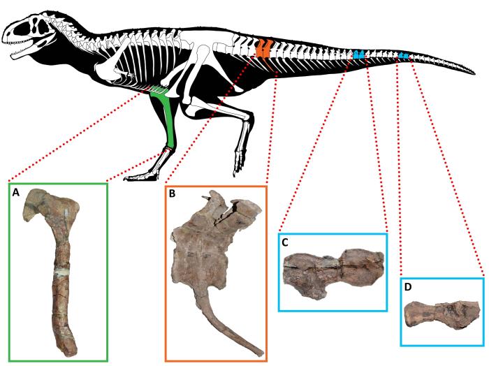 阿貝力龍病理學樣本。A.加氏奧卡龍(尾椎根部先天性病變) ;B.迷霧嚙王龍(尾椎中段和頂端脊柱關節病); C柯氏基爾梅龍(右脛骨可能有病變) (圖片來自Alessio Ciaffi)。施普林格·自然/供圖