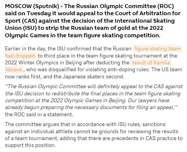 俄羅斯花樣滑冰聯(lián)合會強調(diào),將采取一切必要措施,包括在法庭上,保護團隊和運動員的權(quán)利和合法利益,“維護我們滑冰運動員的利益始終是聯(lián)合會的首要任務(wù)”。