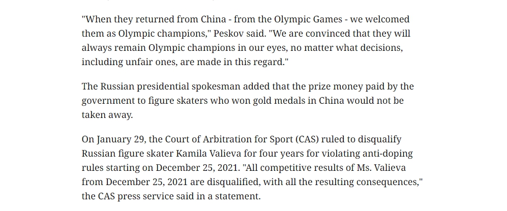 此外,俄羅斯衛(wèi)星通訊社在此前另一篇報道中稱,俄羅斯總統(tǒng)新聞秘書佩斯科夫表示,被處罰一事是政治化的決定,俄羅斯將提起上訴。佩斯科夫強調(diào)將始終保護運動員的利益。“如果有任何上訴機制,我們當(dāng)然應(yīng)該使用起來。”