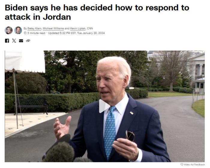 中新網1月31日電 據美國有線電視新聞網(CNN)報道,當地時間30日,美國總統拜登表示,他已就美國如何應對約旦美軍基地遇襲事件做出決定。早些時候,該襲擊造成3名美軍士兵死亡、數十人受傷。