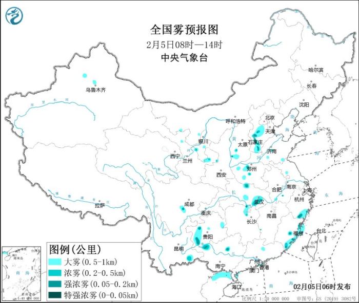 中央氣象臺2月5日06時繼續發布大霧黃色預警:預計,5日早晨至上午,雷州半島沿岸海域、粵西沿岸海域、北部灣偏北海域、福建沿岸的部分海域將有大霧,能見度不足1公里。此外,河北西部、山西西南部、河南南部、湖北中東部、浙江東南部、福建東部、貴州西部等地有大霧天氣,局地有能見度不足200米的強濃霧。