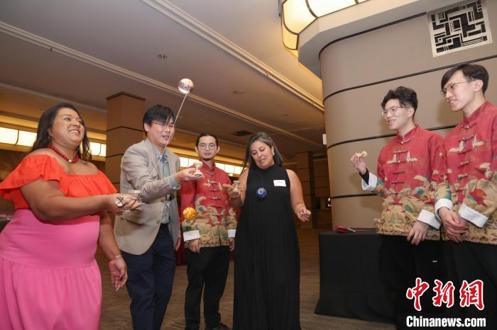 2月8日,曾在香港和國際賽事中屢獲殊榮的香港劍球(亦稱劍玉)隊成員(著唐裝者)獲香港駐多倫多經(jīng)貿(mào)處邀請訪加并出席新春酒會時,指導(dǎo)與會嘉賓體驗劍球。 中新社記者 余瑞冬 攝
