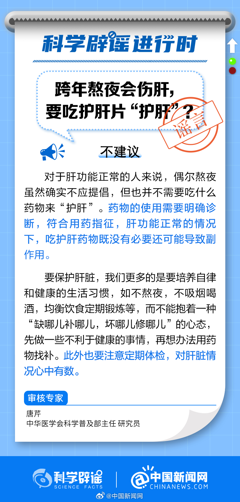 中新網2月10日電 對于肝功能正常的人來說,偶爾熬夜不需要吃什么藥物來“護肝”。藥物的使用需要明確診斷,符合用藥指征,肝功能正常的情況下,吃護肝藥物既沒有必要還可能導致副作用。要保護肝臟,我們更多的是要培養自律和健康的生活習慣,如不熬夜、不吸煙喝酒、均衡飲食、定期鍛煉等。(來源:@科學辟謠 中國新聞網微博)