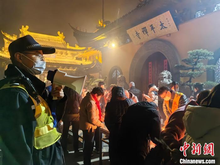 “太平禪寺零點前后達到瞬時人流高峰,人流量接近往年峰值人數的兩倍?!鄙虾J泄簿謱毶椒志诸櫞迮沙鏊L何相俊說。位于上海市寶山區太平禪寺的龍年撞鐘、燒頭香等活動,吸引了大量市民前來進香。為應對2月9日晚至2月10日凌晨的短時大客流,顧村派出所在寺廟入口處增設了蛇形緩沖通道,預計可同時容納500人以上有序排隊入寺。