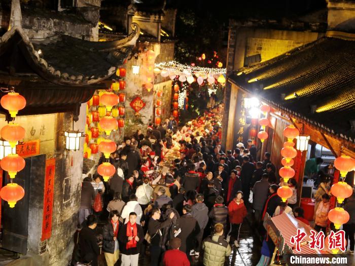 中新網懷化2月10日電 (付敬懿 李林)“開席咯,上頭碗,大吉大利,黃精燉雪峰烏骨雞;第二碗,前程似錦,黔陽雪粑鴨;第三碗,牛氣沖天,干鍋高山黃牛肉;第四碗,年年有余,黃燜昌齡魚……”2月9日晚,除夕夜,湖南懷化洪江市黔陽古城內,一張張桌子擺滿大街小巷,當地居民和游客共嘗長龍宴,歡迎龍年到來。