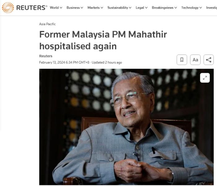 外媒:98歲馬來西亞前總理馬哈蒂爾再次入院