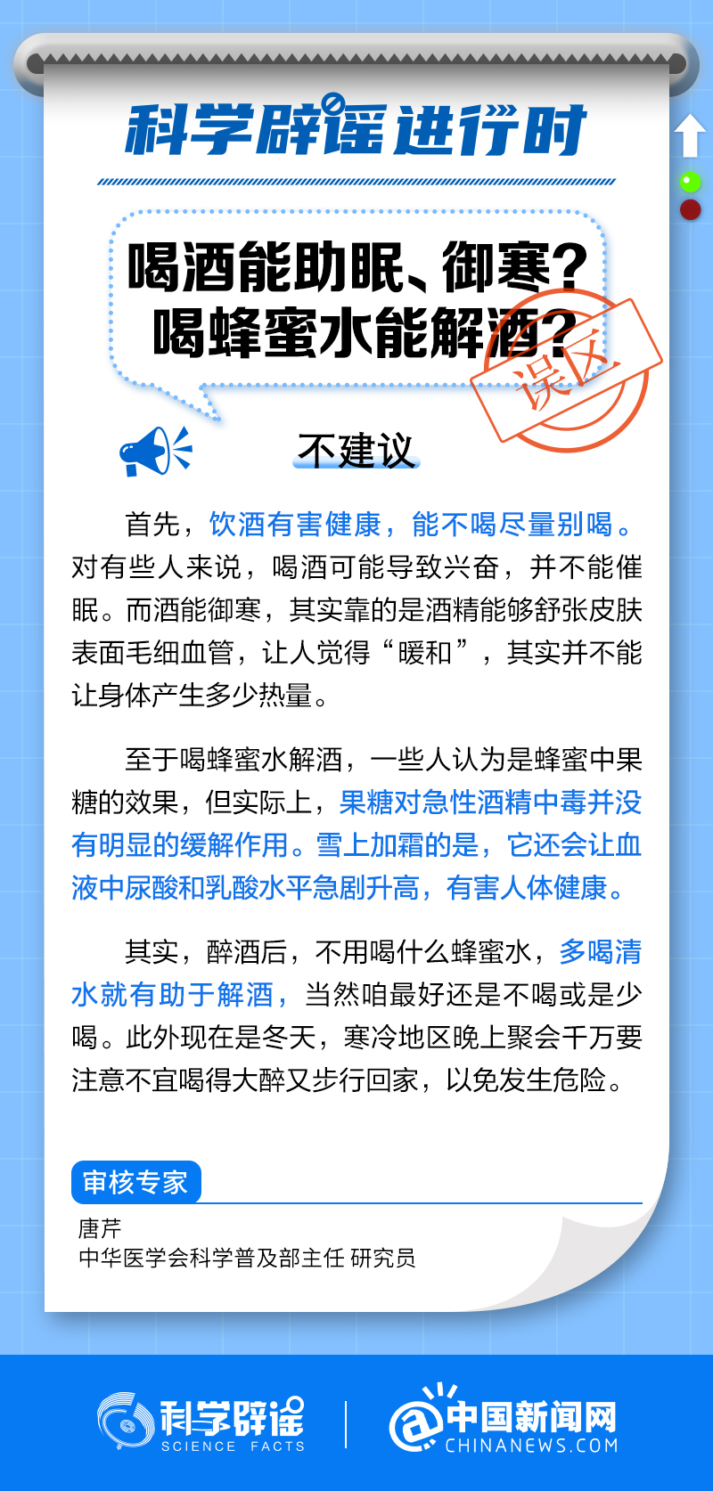中新網(wǎng)2月13日電 飲酒有害健康,能不喝盡量別喝。對有些人來說,喝酒可能導(dǎo)致興奮,并不能催眠。而酒能御寒,靠的是酒精能夠舒張皮膚表面毛細(xì)血管,讓人覺得“暖和”,其實(shí)并不能讓身體產(chǎn)生多少熱量。至于喝蜂蜜水解酒,一些人認(rèn)為是蜂蜜中果糖的效果,但實(shí)際上,果糖對急性酒精中毒并沒有明顯的緩解作用。它還會(huì)讓血液中尿酸和乳酸水平急劇升高,有害人體健康。(來源:@科學(xué)辟謠 中國新聞網(wǎng)微博 )