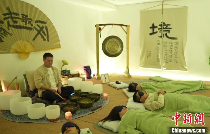 待大家緩緩躺下,蓋好被子、戴好眼罩后,魏慶宏用音錘緩緩在缽體上摩擦、敲擊。隨著陣陣沉穩悠長的“嗡嗡”聲,顧客漸漸進入睡眠狀態。他說,來體驗的年輕顧客居多。