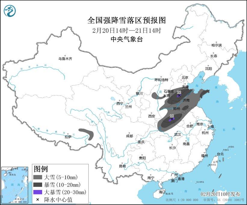 中新網2月20日電 據中央氣象臺網站消息,預計2月20日14時至2月21日14時,陜西北部、山西東南部、河北南部、山東、河南、安徽北部、湖北西部、西藏東部等地部分地區有大到暴雪,其中,河北南部、河南南部等地局地有大暴雪(20~22毫米)。上述部分地區新增積雪深度3~8厘米,局地可達12厘米以上。