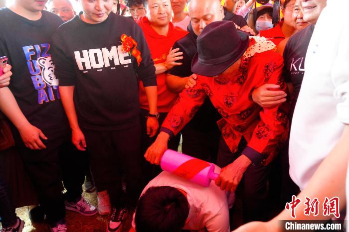 “酒醉公”手持搟面杖,逐一“打”前一年剛結婚的“新郎官”。永定區融媒體中心供圖