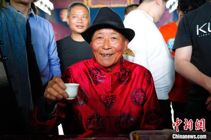 當天14時,永定區坎市鎮盧氏祠堂周圍人頭攢動,鞭炮齊鳴,十分熱鬧。大家從十里八村涌到祠堂前,待用香燭、三牲敬過“林婆太”后,兩名壯漢攙扶著一位滿臉通紅、一身酒氣的“酒醉公”。
