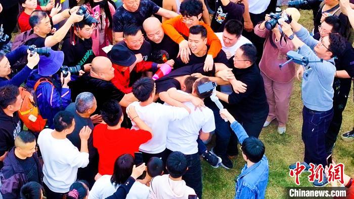 “祝你早生貴子!又生貴子!雙生貴子!”而被“打”的新郎官才直起身,笑呵呵地走開。“打”完一個,還有一堆……