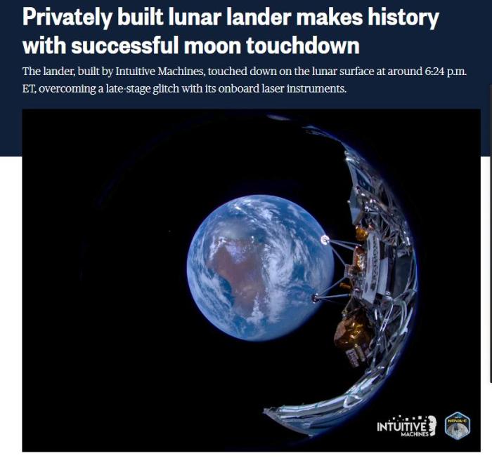 據報道,由“直覺機器” 研發的著陸器于美東時間下午6點23分左右降落在月球表面。該著陸器是自1972年“阿波羅17號”任務以來第一艘登上月球的美國航天器。