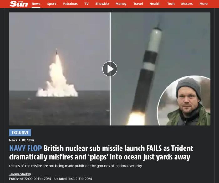 據《太陽報》報道,英國皇家海軍“先鋒”號核潛艇于1月30日在美國佛羅里達州附近海域,進行了一次“三叉戟II”型導彈發射演習,然而發射的導彈第一級推進器并未按計劃點燃,導致這枚重達58噸的導彈(裝有假彈頭)掉進海中。