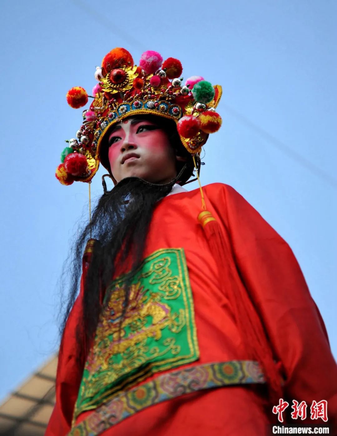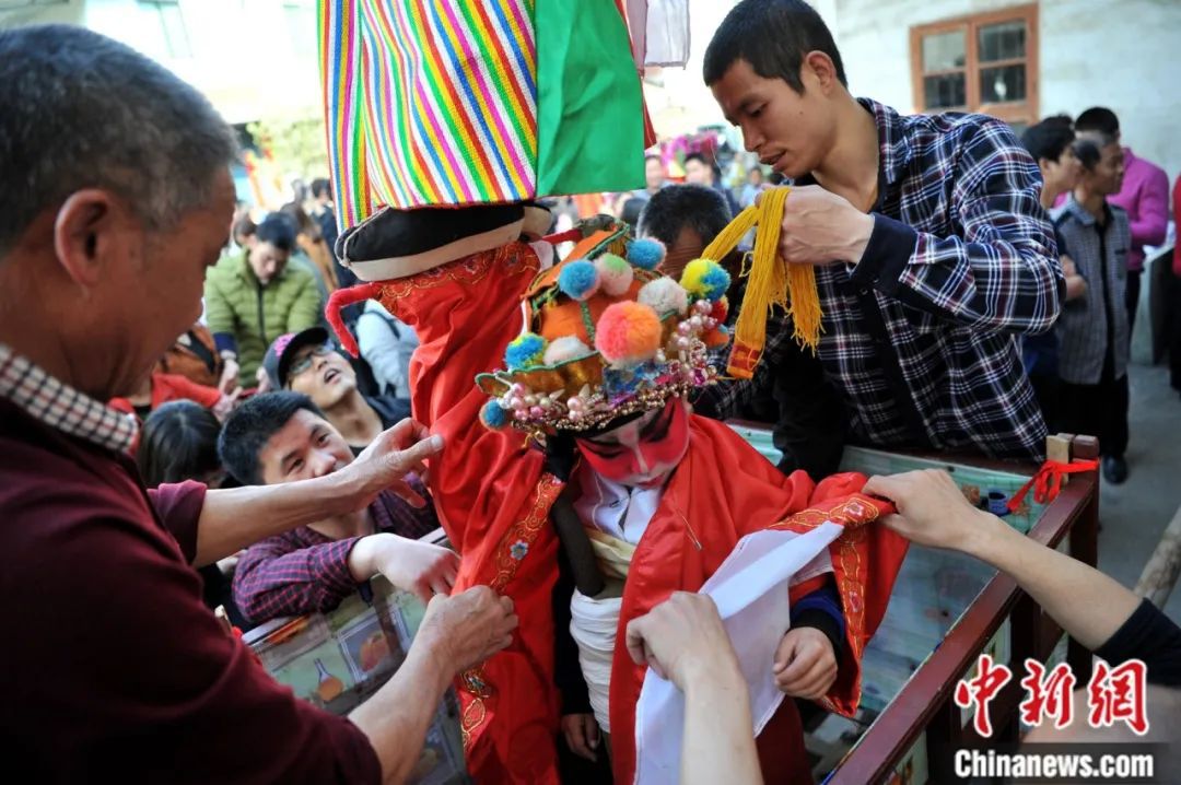 連城縣羅坊鄉(xiāng)舉行國家級非物質(zhì)文化遺產(chǎn),享有“中國客家狂歡節(jié)”美譽(yù)的“走古事”民俗活動(dòng)。圖為立于轎臺之上參加“走古事”的兒童。中新社記者 張斌 攝