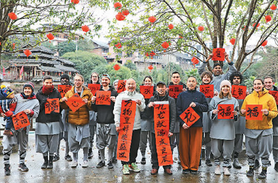春節期間,廣西壯族自治區桂林市靈川縣九屋鎮西嶺山莊迎來一批外國客人,他們一起寫福字、磨豆腐、舂糍粑、釀圓子……沉浸式體驗中國傳統民俗,現場歡聲笑語不斷。