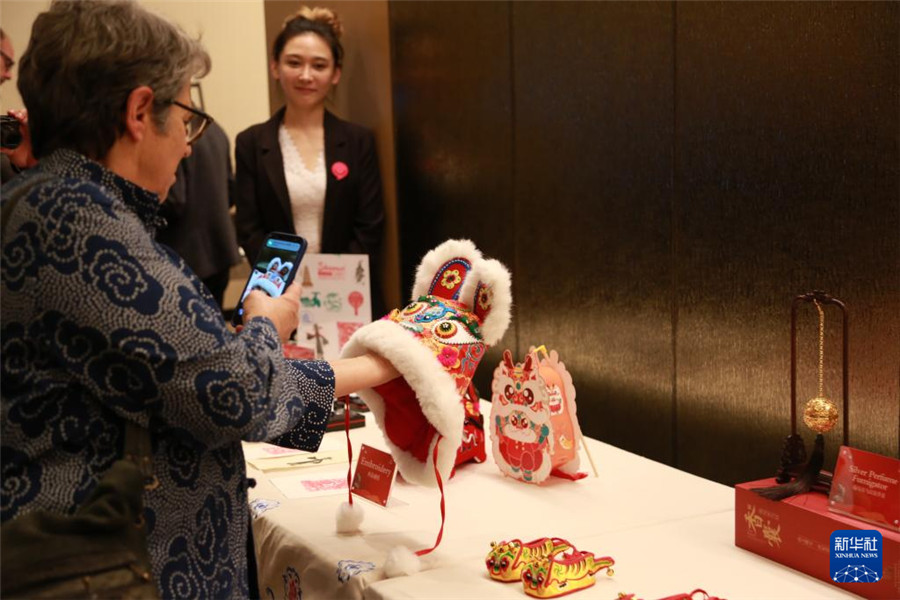 2月27日,在美國紐約,一名參會者在陜西省文化和旅游廳與中國駐紐約旅游辦事處舉辦的陜西文化旅游推介會上拍攝陜西民俗產品。新華社記者 劉亞南 攝