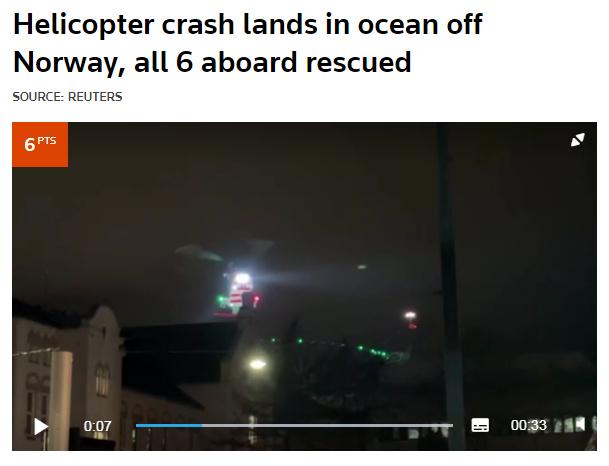 一架直升機在挪威附近海域墜毀 機上6人全部獲救