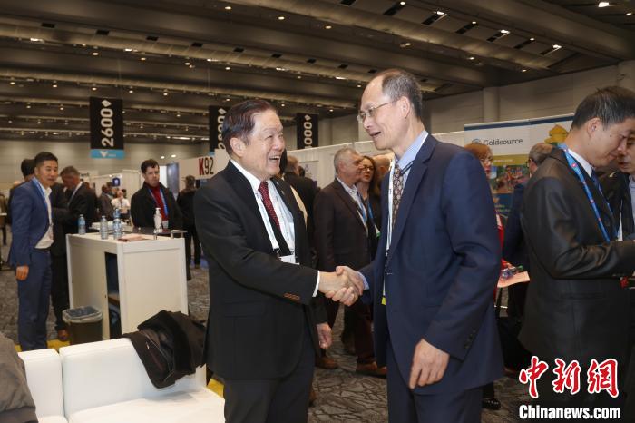 當地時間3月3日,2024年加拿大國際礦業大會(PDAC)在多倫多揭幕。圖為加拿大聯邦參議員胡子修(左)與參展中國企業紫金礦業集團股份有限公司副總裁沈紹陽交流。中新社記者 余瑞冬 攝