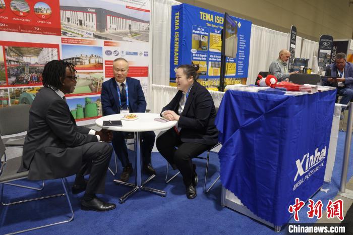 當地時間3月3日,2024年加拿大國際礦業大會(PDAC)在多倫多揭幕。圖為中國企業山東鑫海礦業技術裝備股份有限公司參展代表與客商洽談。中新社記者 余瑞冬 攝