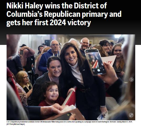 據(jù)美聯(lián)社報道,當?shù)貢r間3日晚,華盛頓特區(qū)共和黨官員公布結(jié)果,黑利獲勝,贏得該區(qū)域所有19張代表票。