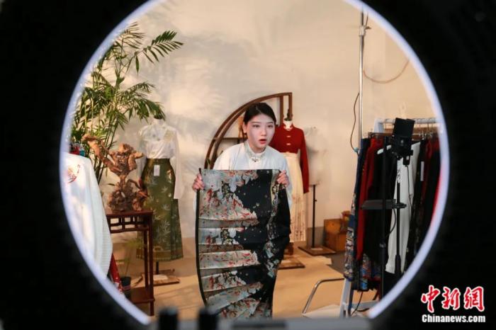 主播正在直播間銷售馬面裙。梁犇 攝