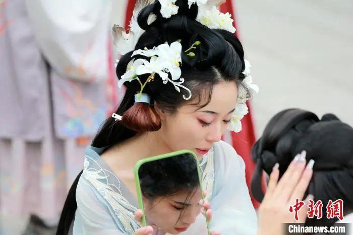 民眾著華服整理發飾。梁犇 攝