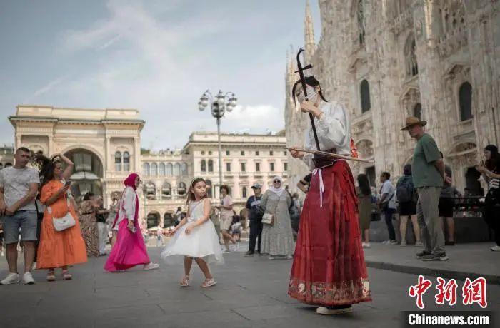 2023年8月,山東濰坊留學生鄭曉慧身穿馬面裙在意大利米蘭街頭演奏二胡。(鄭曉慧供圖)