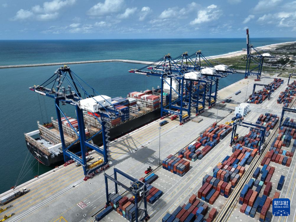 3月11日,一艘貨輪在尼日利亞拉各斯萊基深水港裝卸集裝箱(無人機照片)。新華社發(萊基港公司供圖)