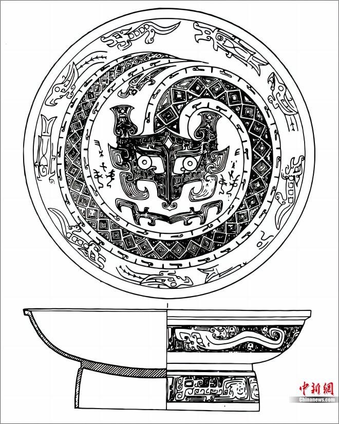 商代晚期青銅器獸面紋線圖。受訪者供圖