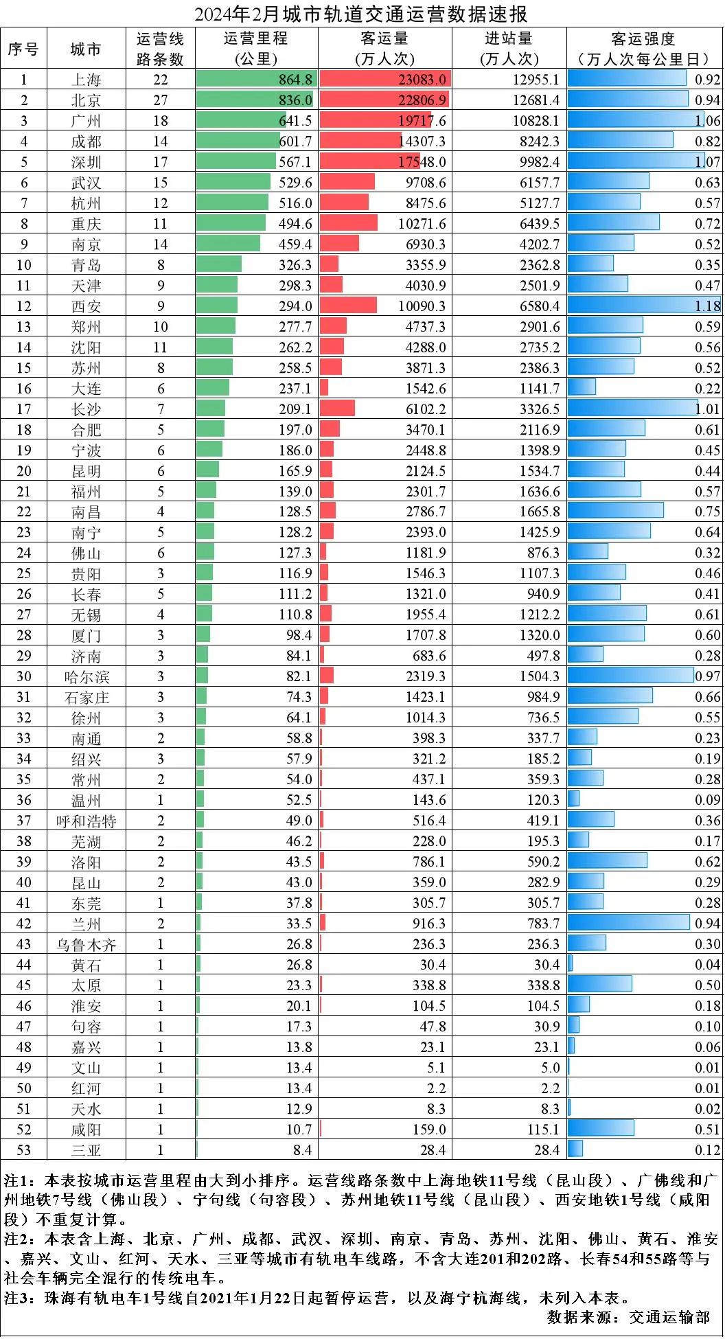 中新網3月12日電 據交通運輸部微信公眾號消息,2024年2月,31個省(自治區、直轄市)和新疆生產建設兵團共有55個城市開通運營城市軌道交通線路308條,運營里程10205.6公里,實際開行列車317萬列次,完成客運量20.5億人次,進站量12.4億人次。2月份,客運量環比減少6.1億人次,降低22.9%,同比減少1.3億人次,降低6%。2月份全國總運營里程的平均客運強度為0.693萬人次每公里日,環比降低17.6%,同比降低14.4%。本月無新開通線路。