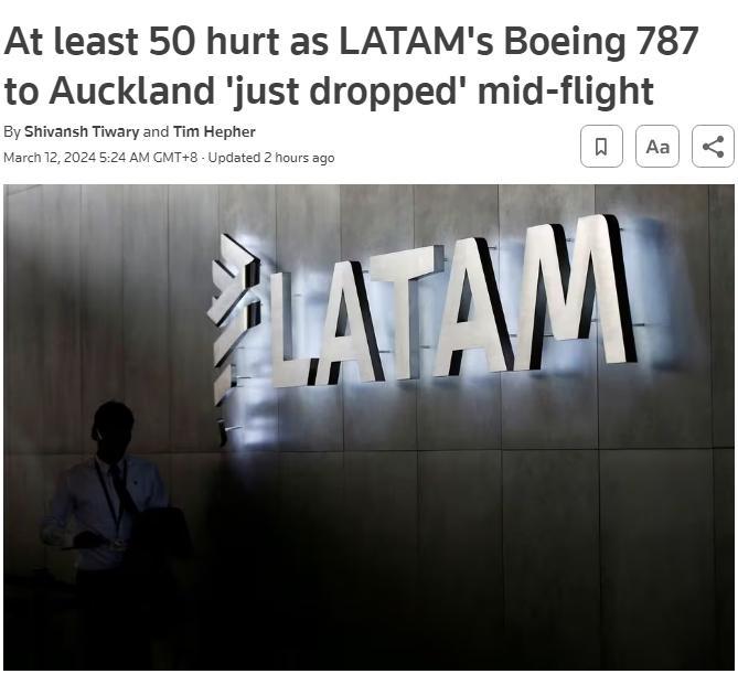 當時, 總部位于智利的拉塔姆航空公司一架從澳大利亞悉尼飛往新西蘭奧克蘭的波音飛機,因技術問題,在飛行途中急降,“劇烈俯沖”數秒,導致乘客撞上機艙頂,造成至少50人受傷。