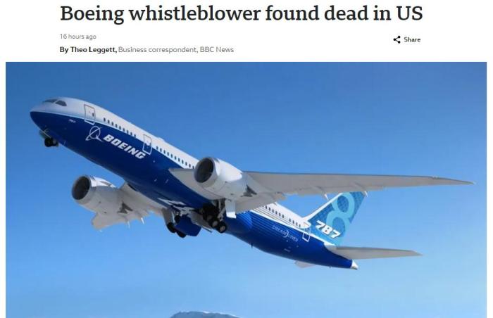 據BBC最新消息,這名曝光波音質量亂象的“吹哨人”,于2024年3月9日被發現在美國一家酒店停車場內身亡,事件正在調查中。
