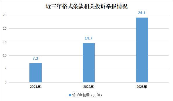 2023年,全國12315平臺共接收合同問題投訴舉報194.3萬件,同比增長25.2%。其中,經營者利用合同格式條款排除消費者權利、經營者利用合同格式條款加重消費者責任、經營者利用合同格式條款免除自身責任三項合計24.1萬件,同比增長63.9%。從商品服務類別來看,服務類合同問題投訴舉報126.4萬件,同比增長32.8%,占合同問題總量的65.1%。服務類消費具有更強的主觀性,合同簽訂及履行問題較為嚴重,比較容易引發消費糾紛。2023年,極為火爆的旅游市場頻頻出圈,各類消費問題也隨之浮現。全國12315平臺接收旅游服務投訴舉報13.8萬件,同比增長2.2倍;其中合同問題2.5萬件,占比18.1%。消費者反映的問題主要集中在商家設定不合理條款導致退款困難、商家未按合同約定提供相應的商品或服務、以不公平格式條款要求消費者支付高額違約金等。