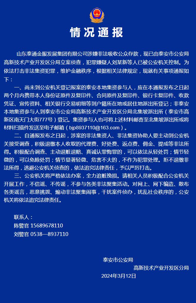 中新網3月13日電 山東泰安高新警方12日在官方微信公眾號發布山東泰通金服發展集團有限公司涉嫌非法吸收公眾存款的情況通報,目前該案件已由泰安市公安局高新技術產業開發區分局立案偵查,犯罪嫌疑人劉某新等人已被公安機關控制。為依法打擊非法集資犯罪,維護金融秩序,根據相關法律規定,現就有關事項通報如下: