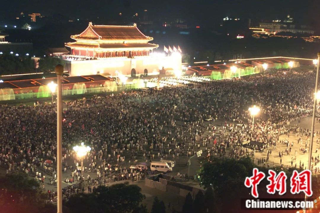 2001年7月13日晚,北京天安門廣場人潮涌動,數以十萬計的民眾徹夜不眠慶祝北京申奧成功。毛建軍 攝