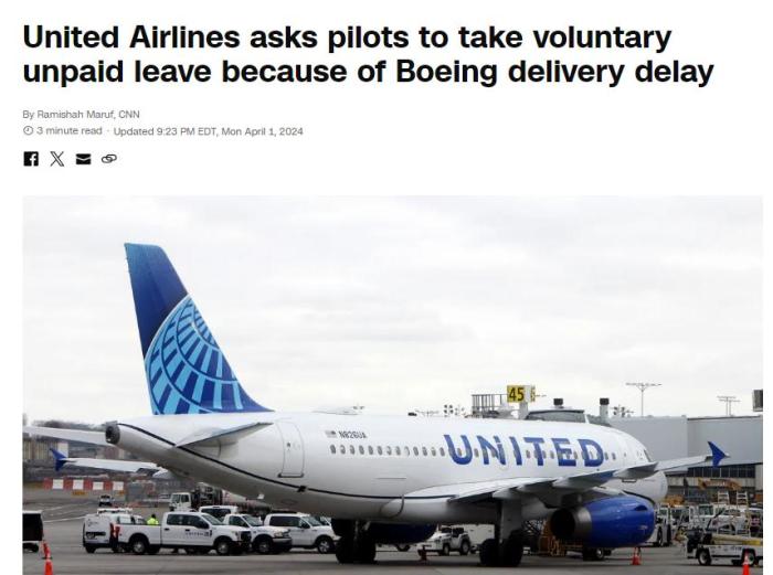 據美國消費者新聞與商業頻道(CNBC)報道,美聯航證實了無薪休假的請求。該航空公司此前還表示,由于波音公司的飛機延遲交付,它將在2024年春天暫停招聘飛行員。