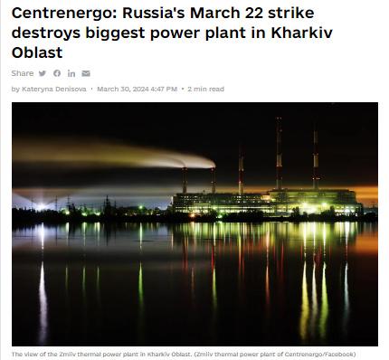 中新網3月31日電 據《基輔獨立報》當地時間30日援引烏克蘭能源公司消息,烏東部最大發電廠、位于哈爾科夫州的茲米耶夫火力發電廠已在俄軍22日的導彈襲擊中被摧毀。