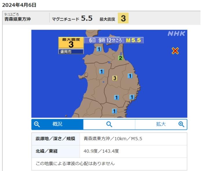 中新網4月6日電 據日本廣播協會(NHK)報道,當地時間6日9時12分,日本青森縣海域發生5.5級地震,震源深度10千米。