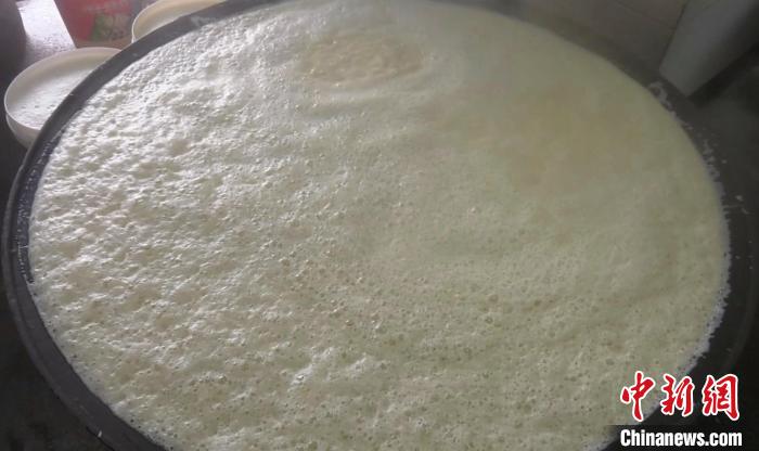 煮豆漿時,一口可以裝滿200公斤豆漿的鐵鍋,被一點點地裝滿,綿密的泡沫溢滿了整個鐵鍋,爐灶中的柴火通過燃燒散發出獨有的清香。