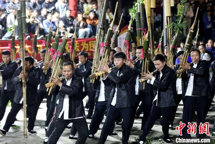 圖為4月4日清明節,廣西三江侗族自治縣獨峒鎮10余支蘆笙隊齊聚一堂,以蘆笙踩堂、蘆笙比響等形式,展示侗鄉多彩風情。龔普康攝