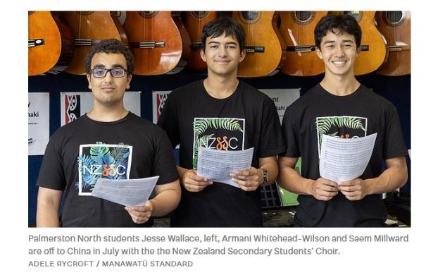 圖為將來中國參加合唱節的3名新西蘭學生。圖片來源于新西蘭Stuff網站截圖
