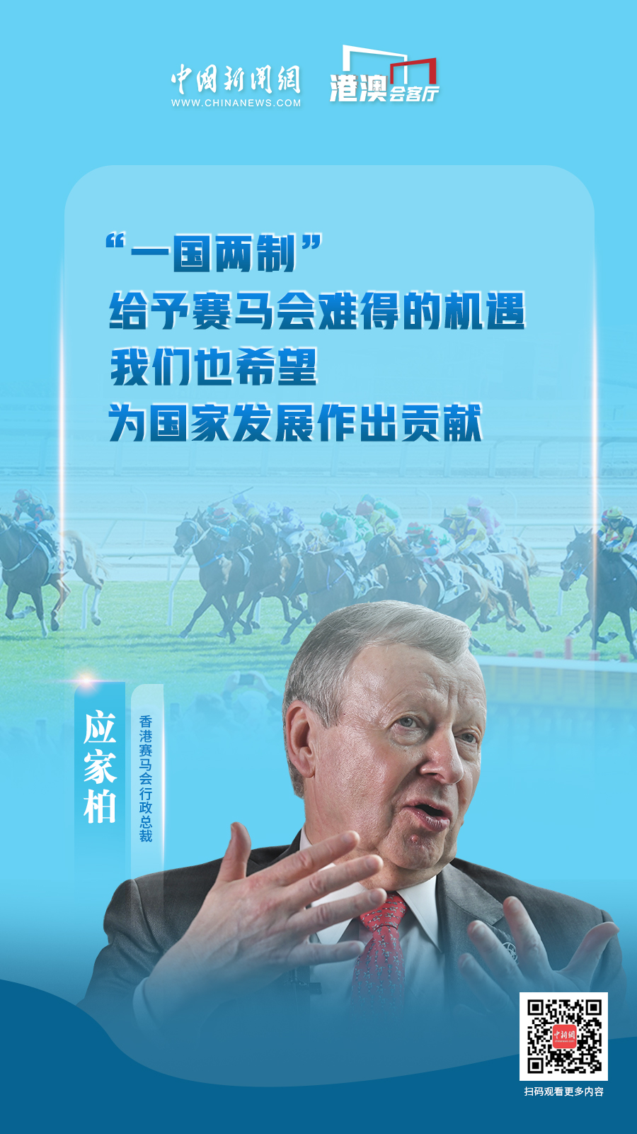 這是應家柏出任香港賽馬會行政總裁的第17年,亦是《粵港澳大灣區發展規劃綱要》發布五周年,他帶領賽馬會緊握機遇,從“一國兩制”優勢,到粵港澳大灣區帶來的發展空間,繼續全方位地豐富著香港的賽馬精神。他如何看待香港賽馬事業發展現狀和瓶頸?未來拓展的方向又在何處?應家柏近日接受中國新聞網“港澳會客廳”專訪,對這些問題一一作出解答。