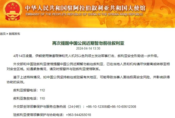使館消息稱,4月14日凌晨,伊朗使用彈道導彈和無人機對以色列領土發動軍事打擊,敘利亞安全形勢進一步升級。