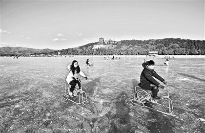頤和園冰場的景色絕佳,冰場四周環(huán)繞著頤和園的亭臺(tái)樓閣,游客在冰面滑行的過程中,可切身感受到古人造園“步移景異”的精妙之處。冰上賞景的最佳選擇是騎行冰上自行車,冰上自行車幾乎對(duì)技術(shù)零要求,因?yàn)橛薪饘倏蚣艿闹危T行時(shí)比普通自行車還要平穩(wěn),冰上自行車可快可慢、可停可站,游客呼吸著清冽的空氣,眼前則是高大雄偉的佛香閣與遼闊的西山群峰,盡管腳下在奮力地蹬車,在不知不覺間已融入到頤和園的山水畫卷之中。