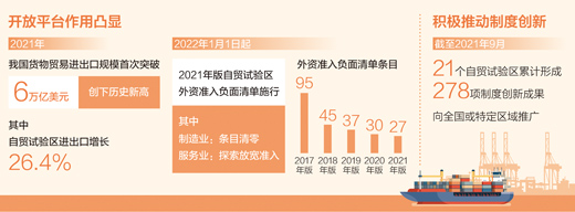 日前,我國2021年外貿成績單發布,貨物貿易進出口規模首次突破6萬億美元。其中,自由貿易試驗區進出口增長26.4%,呈現蓬勃發展態勢。